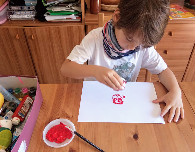 Ok, ho un po' imbrogliato perché invece dei soliti colori abbiamo usato tempere e acquerelli, però in ogni caso non era scontato che il pupo di casa si facesse coinvolgere con entusiasmo.